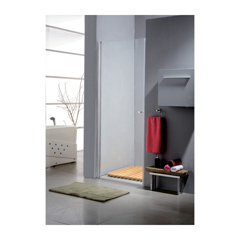 Parta battente in cristallo serigrafato con spessore da 6 mm. Profili in alluminio cromato liscio. Maniglia a pomolo. Altezza 190 cm. Estensibilit 88 x 92 cm.