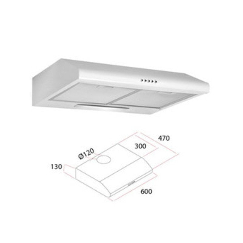 Lampada 40W. Filtro grassi. Cruscotto 5 comandi. Flangia ø 125 mm. Facile da montare e da pulire. Dimensioni 60 x 47 x h 13 cm. Peso 5 kg.