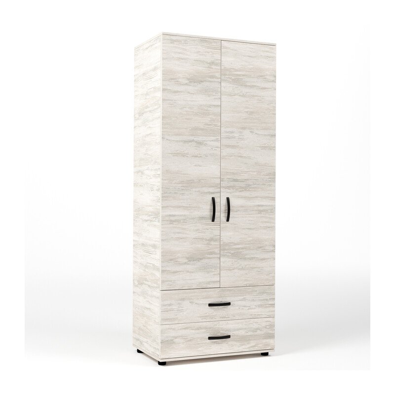 armadio due ante e due cassetti. Una asta appendiabiti interna. Maniglie in metallo, piedini regolabili. Dimensioni 80 x 52 x h 205 cm. Colore bianco ven.