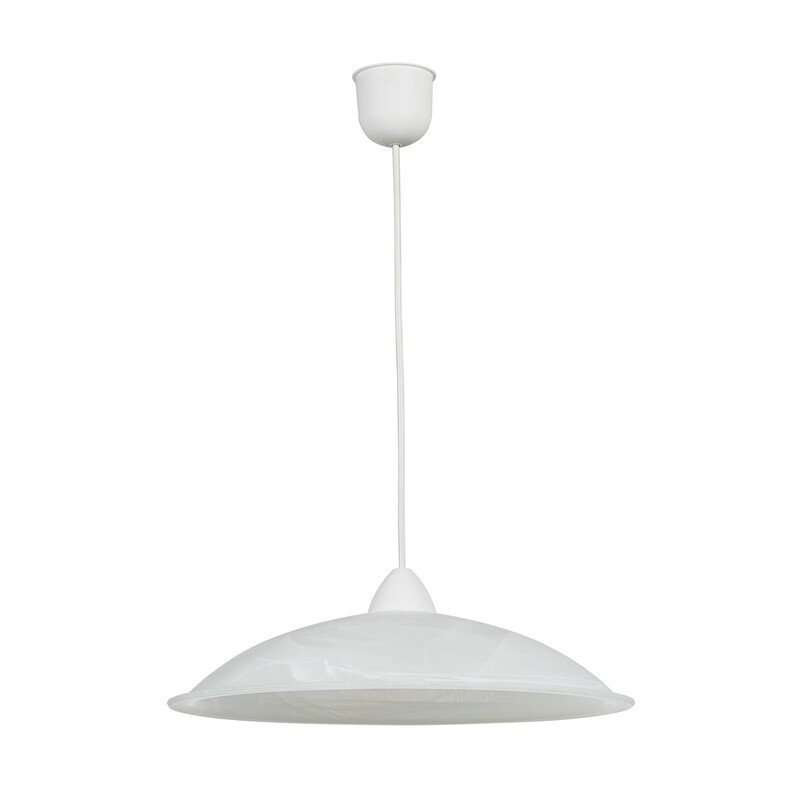 Sospensione a soffitto con montatura in plastica bianco, realizzata con vetro centrifugato alabastro bianco e sabbiato esterno. Attacco E27 (grande) – 220/240V – 50 Hz – IP20. Max wattaggio lampadina 57W (non inclusa). Dimensioni ø 40 cm. Peso 2,25 kg.