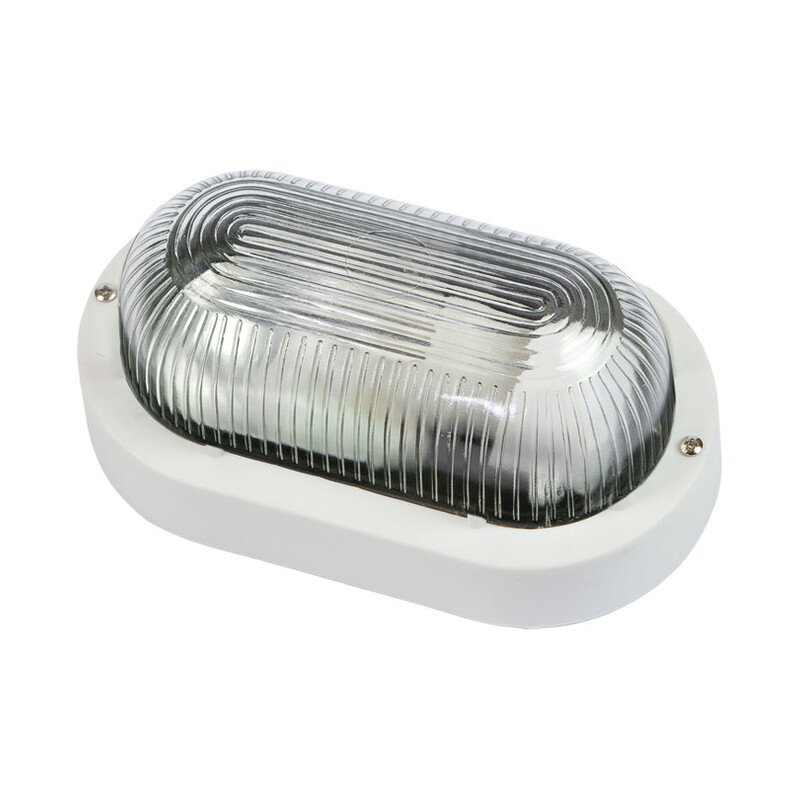 in polipropilene con copertura in vetro e griglia di protezione. A norme EN 60598-1 e EN 60598-2-1. Portalampada E27 (attacco grande) per lampade ad incandescenza (max 60W) o a basso consumo (max 11W). Grado di protezione IP44. Base 188x120xh100 mm. Colore bianco.
