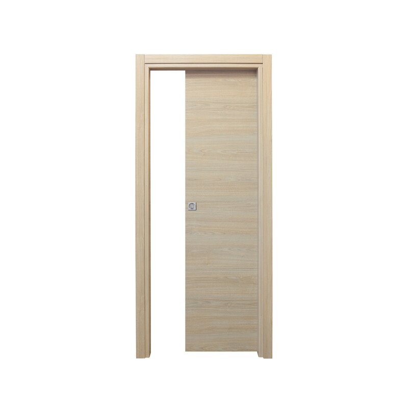Anta tamburata di spessore nominale 44 mm, riempimento in cartoncino trattato, placcato con pannelli in MDF spessore 3/4 mm nobilitato con carta finish. Telaio piatto in MDF di spessore 40 mm con guarnizione di battuta di gomma. Coprifilo telescopici esterno ed interno in Mdf da 65 mm con aletta utile da 8 mm. Ferramenta serratura. Scorrevole. Dimensioni 210×60 cm. Colore rovere sbiancato